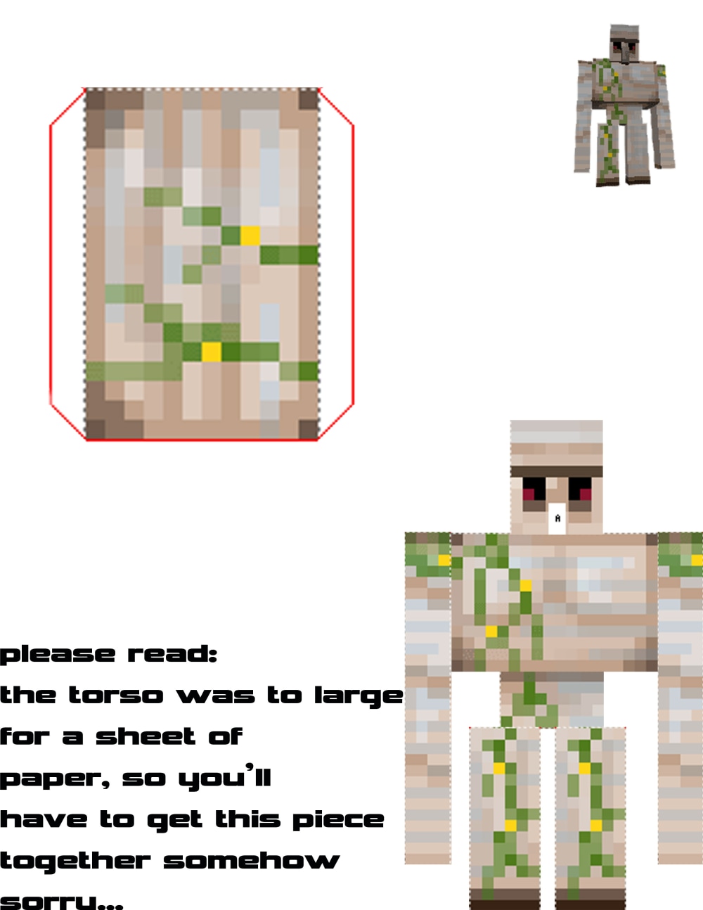 Here is the Iron Golem! It seems that it will be getting easier and easier to make these in the right proportion. Stay tuned for more, i will have pics soon! P.S. I forgot to make the iron golem "bigger", it was to late to revise, i might get back to it latter, enjoy!