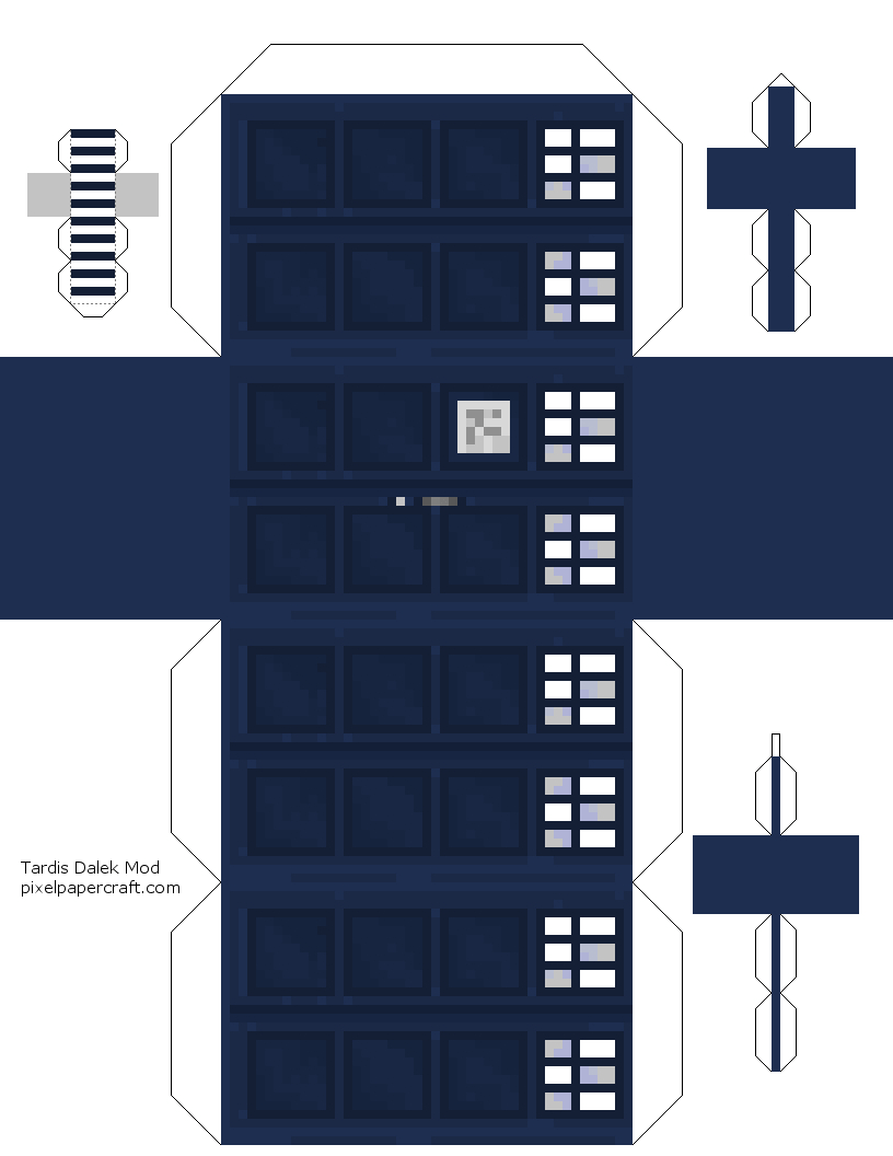 This design of the tardis actually fits on regular printer paper. To make it fit I had to cut off some small pieces of a couple flaps.They are unnoticeable once put together. This came from the dalek mod. Download link here: http://www.minecraftforum.net/forums/mapping-and-modding/minecraft-mods/1286606-the-dalek-mod-updated-06-09-14 Credit towards obsidianpickaxe for making the original design.