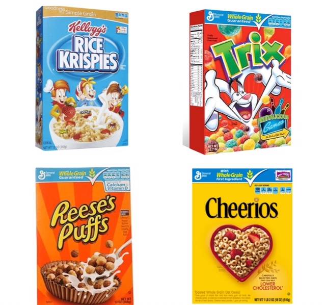 (From left to right) The first box is Rice Krispies, the second box is Trix, the third box is Reese's Puffs, and the fourth box is the famous Cheerios we all know and love.