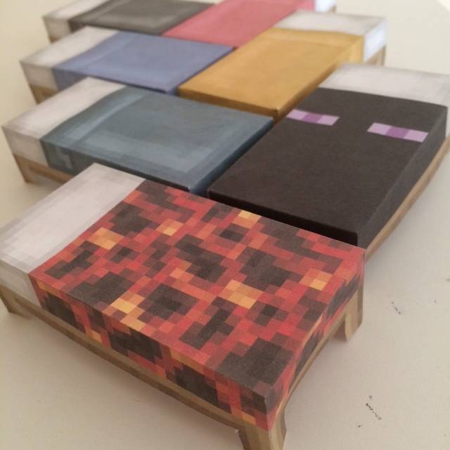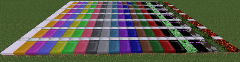 Each bed from the Colored Beds mod including all the colored beds, the Leaves bed, the Cow bed, the Enderman bed, Creeper bed, and Lava bed.