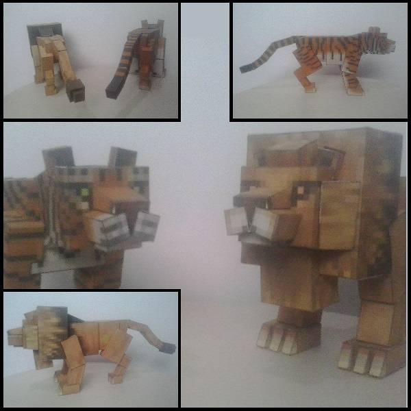 Papercraft: Tiger Description: Tigers are very aggressive, and will sprint and chase down their prey, this can range from a ants, wolves, boars and to deer. Big cats are one of the fastest, if not the fastest mountable mobs in Mo' Creatures. They are even faster when flown (if they have wings). Tigers can be made to sit by either right-clicking on the ground or on itself with a whip. There are 3 types of tigers; the normal one, the white, and the flying. Designer: Brunomik Photo: Brunomik Level: Hard Pages: 7 Pieces: 37 This design was requested by @ximenalpezrivera. You can print this design at A4/letter size for the cub, and at A3 size for the adult, that way it won't be too hard to make. Hope you like it :3 OBS: I also made the other Big Cats from the mo'creatures mod.. i'll upload them asap on my Blog (when i manage to have a picture of them :/)