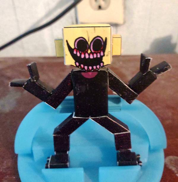 Monster appears to be a demonic humanoid creature with a body mostly comprised of black scribbles apart from his neck, which is instead a violet-pink color. He only has two stubs on each hand and each foot. His head is in the shape of a lemon with bloodshot eyes and eerily large black pupils. He always has a wide open smile with light-pink teeth that extrude from his mouth. Blood stains the roots of his teeth and the bottom of his eyes.