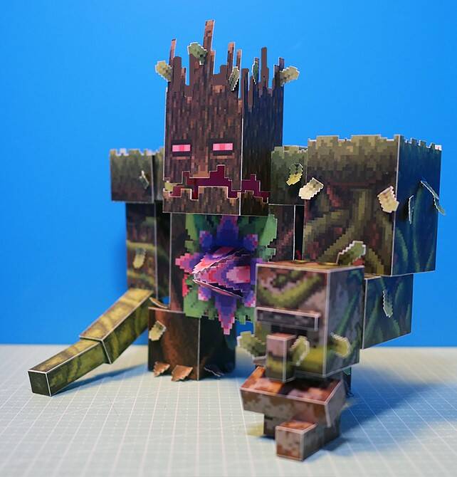 The Jungle Abomination appears to be a hulking beast composed of logs, dirt and stone, and has moss and vines growing on it. Its left arm has what appears to be a villager statue on the end, bound by its vines, and its right arm is a vine. It has glowing eyes similar to that of an enderman, as well as its mouth and a large flower on its torso where the shard is located. It is 7.2 blocks tall.