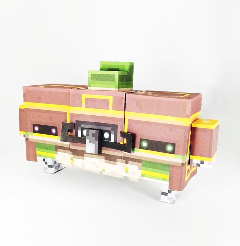 The powersmith is a mysterious and wide mob that seems to be some kind of golem. It is composed of three mobs forming a wider mob. The first and middle body has grey skin like an illager, has a long curly moustache, wears a long robe with various golden lines and accents that connect to its left and right bodies, and has a small staircase-shaped green hat atop its head. Its having a small arm on either side, and both wearing a small green apron with gold lines. Like the tower keeper, they have similar eye colors with the main body having light blue, the right purple, and the left green, they also wear a wide and weathered apron that covers their small legs.