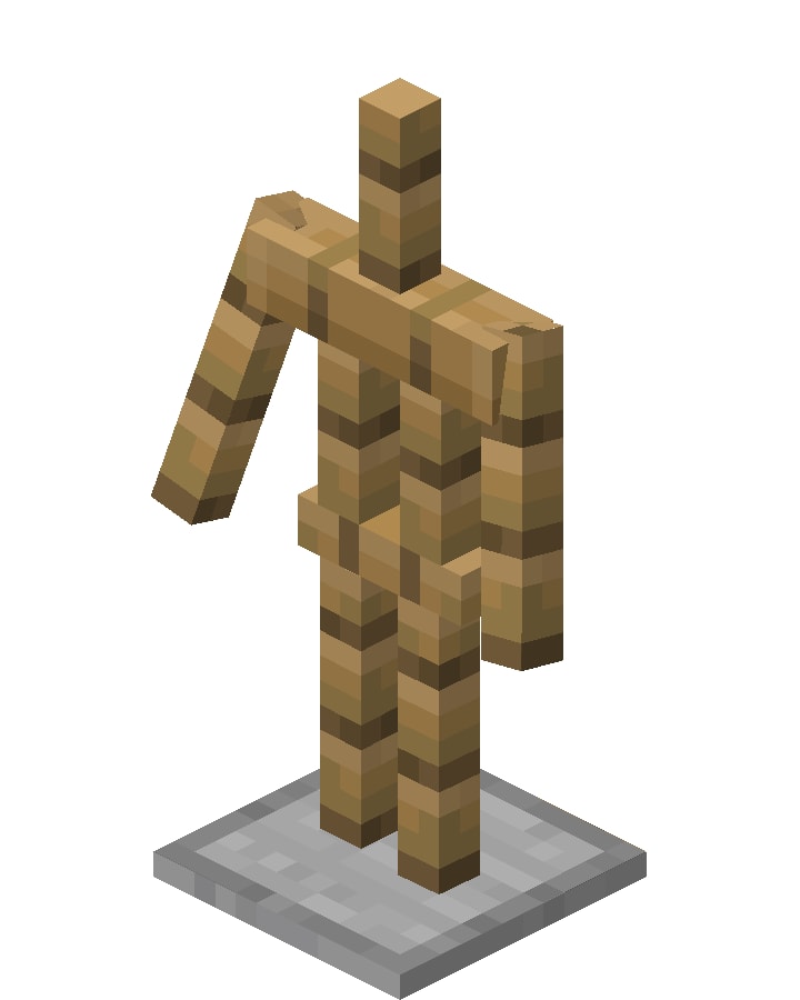 i designed a 1.14 style armor stand and tried to make it as accurate as possible based on the texture mapping shown on the wiki. its arms can move up and down, it's head can swivel, and it has two pars of interchangeable legs (two attached to the baseplate and two on their own)