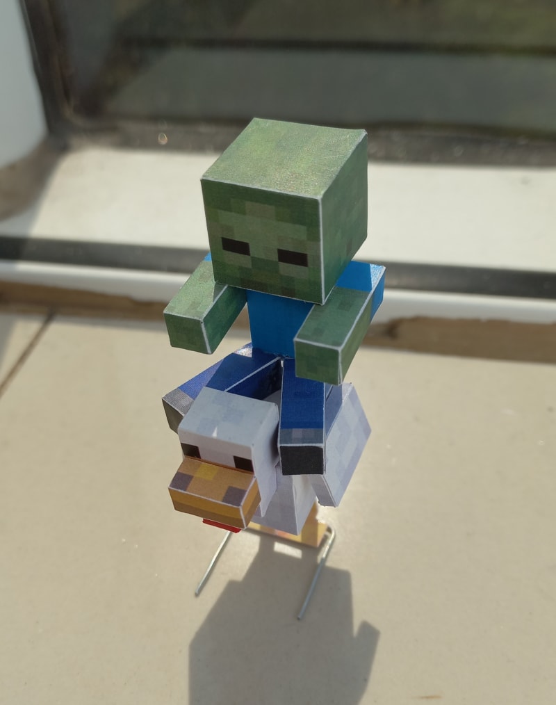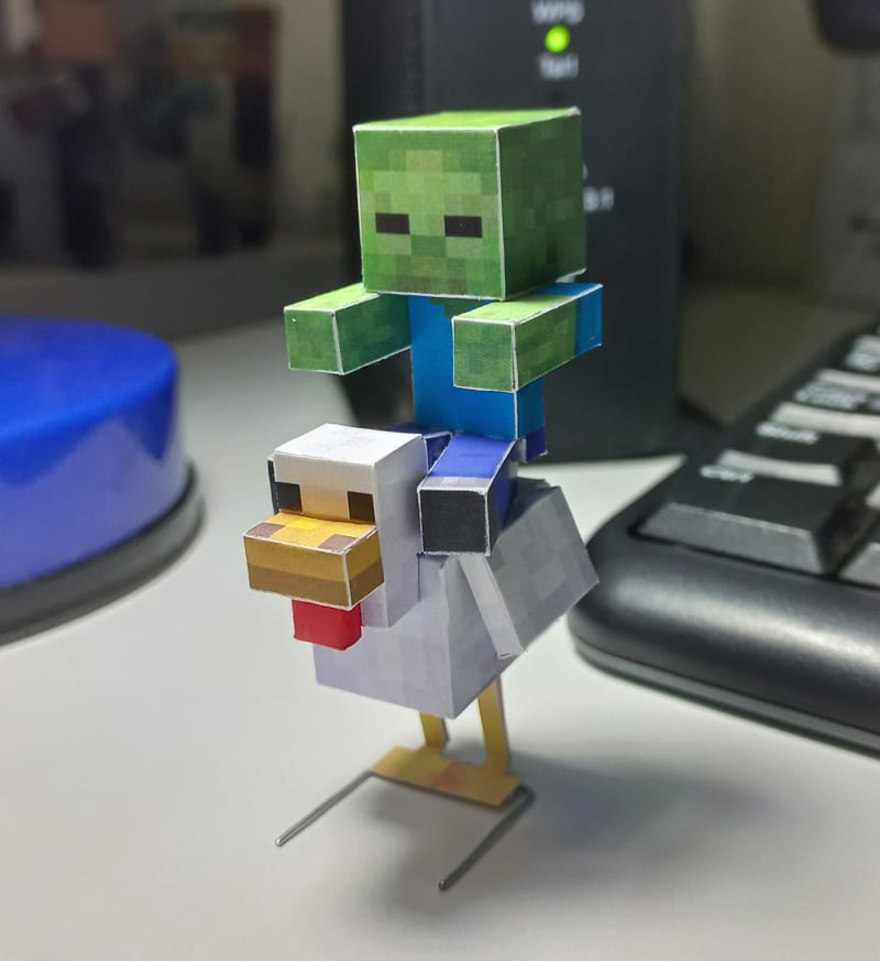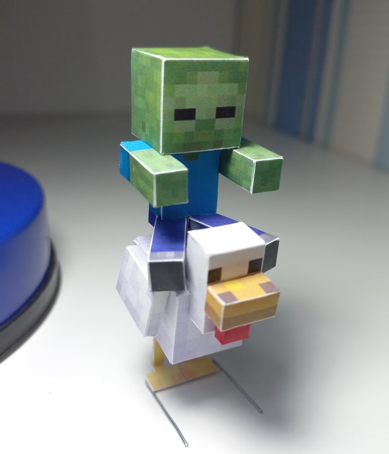 Chicken Jockey is a Mob that consit in a Baby Zombie mounted on a Chicken. Chicken jockeys generally run around, behaving like the zombie, instead of using the chicken AI. Chicken jockeys fall slowly and do not take fall damage, like normal chickens. The chicken moves at the speed of the baby zombie, which is much faster than a normal chicken. This design is more loyal to the original game, cause of that, its more tough to do, but not impossible. I hope you enjoy the design. Have fun!!