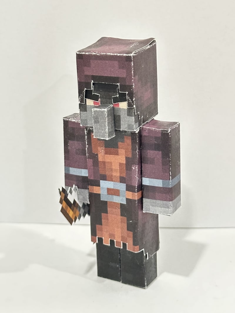 Illusioners are illagers that look very different from illusioners within the original game. Instead of a blue cloak, illusioner wears a dark purple cloak, dark boots, and a hood with dark outlines on the edges. Under the cloak is leather clothing, with a leather bag, belt, and iron buckle. Illusioners also have pink eyes, which are brighter than the eyes of other illagers.