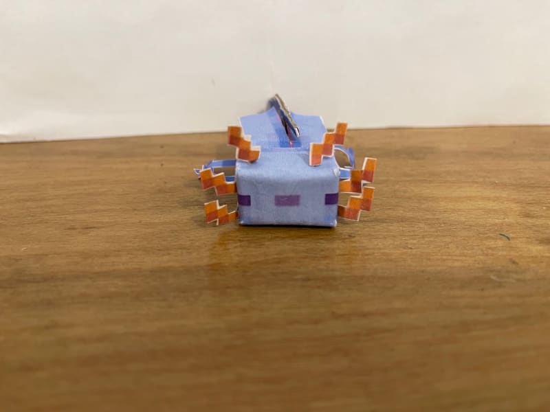 This is the blue Axolotl, I made it alongside a bucket with the Axolotl inside. Cut the red lines, put the tail in the lines, glue the head to the body, glue the hands to the body, and glue the fins to the head.