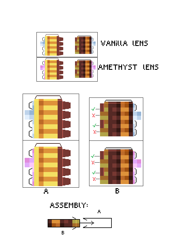 We noticed a lot of papercrafts on this website feel great visually but lack functionnality. So there's your working spyglass! The smaller versions are game and action figure scaled ones, and the larger are scaled up for easier assembly. Both scales present both vanilla and recipe-accurate amethyst-lenses models.