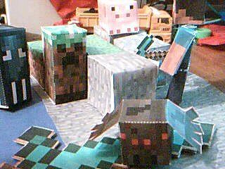 I have the collection of my Minecraft Papercrafts, there are Steve, Diamond Pickaxe, Stone Block, Redstone Ore, Diamond Ore, Mini Pig, Mini Squid, Mini Spider, Mini Earth Creeper and Stone and Water floors/backgrounds. EXTRA: Cardboard Diamond Sword!