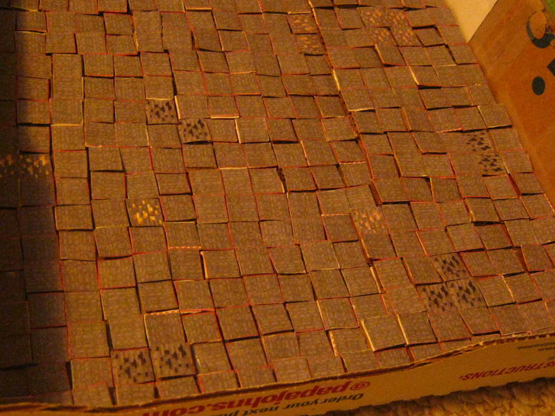 This is my gameboard, I recycled an old pizza box to create this. You can see three of the four types of ores that are included in flatcraft: iron, coal, and gold. There is also diamond, but that is on another layer. Credit for the flatcraft game design goes to nombananas.