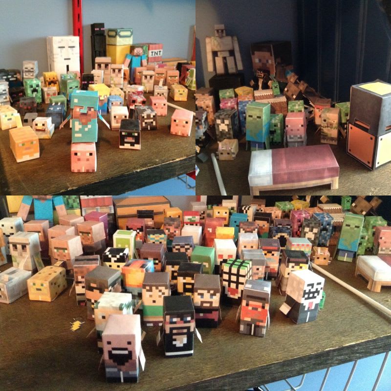 This is my full collection of papercrafts. I'm now moving onto the larger ones from the mini's as well. On the top left is all the vanilla minecraft characters, on the top right are the mods, texture packs, and anything else. On the bottom are the skins.