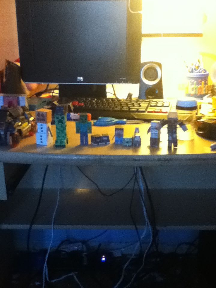 the papercrafts and action figures in the last photo. from left to right: Fall of Cybertron Soundblaster, Snow Golem, Creeper action figure, mini Enderdragon, Zombie action figure, mini Ender Chicken(both), Mini Steve,Mini Sheeper, Mini Donkey, mini spider jockey, and Bendable SCP-106