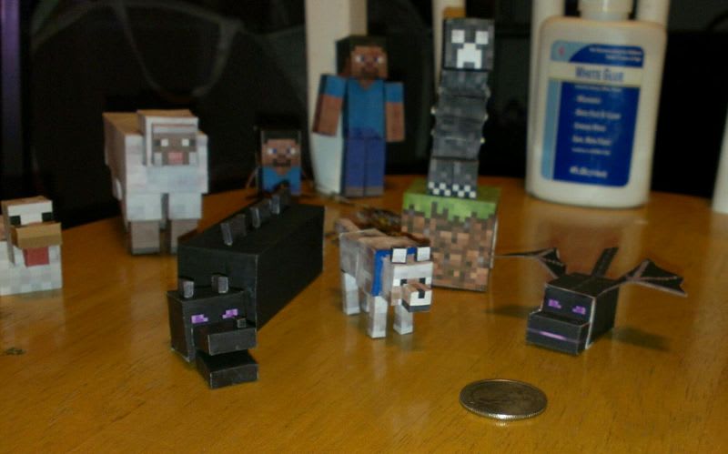 all my papercrafts: Steve,Ender Dragon (in progress),Grass Block,Dark Creeper,Chicken (in progress),Wither,Mini Ender Dragon,Mini Steve,Wild Wolf(i painted the collar),all axes,pick axes,shovels,hoes, and swords.