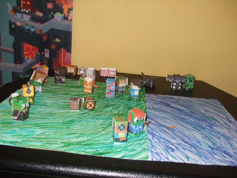 I have sadly ran out of ink of our printer :( so I had to make the grass and water by myself. But at least the minis have a place to be that isn't a box!