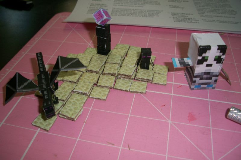 I have a general idea of how this will work. The ender dragon will be controlled by another person, and has to fly for three turns before swooping. The player can try to shoot at the dragon (refer to the skeleton rules on the original flat craft) while it is in air. Then when it swoops, 1 to 2 is a direct hit for the player 1 heart lost, 3 to 5 is a stalemate a hit on the dragon but two hearts lost, and six is knocked into the air lose three hearts. If you die, well... Every five turns, your hunger goes down one notch. it takes six 'hits' to fell the mighty beast. Killing an enderman is the same as any mob, and replenishes one hunger point and you get an ender pearl, which you can use to move three spaces in one turn, or to get up to a pillar and destroy it with a sword. If the ender dragon is flying within one space of the pillar for three turns, one 'hit' is healed. After that it has to go over to another pillar to be healed. your character has to be within one space of a pillar to shoot it and deactivate it. when all of the pillars are deactivated, the ender dragon can no longer heal.