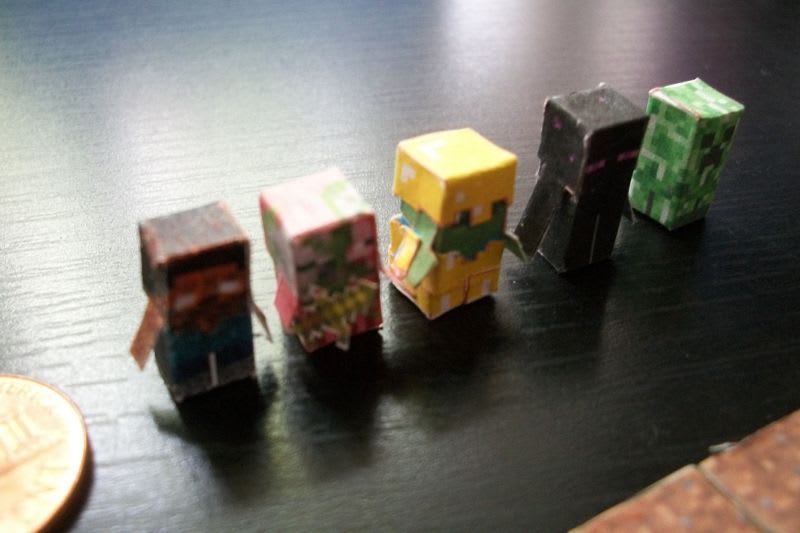 These are from left to right: Herobrine, Zombie Pigman, Bob with gold/ butter armor, enderman(kill five and you can go to the end), and a creeper (not made up, just to show scale) The bob with armor is a request (kind of) from gimmiTheBLUESTONER or something like that I think, right?