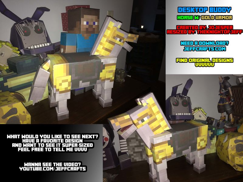 Hey everyone, we finally got a horse! This guy should be perfectly to scale with steve behind him. Video coming soon! Thank You to Jojesper for the original design! http://www.pixelpapercraft.com/papercraft/51d54ed8749618a65500003e/horse-white-with-gold-armour