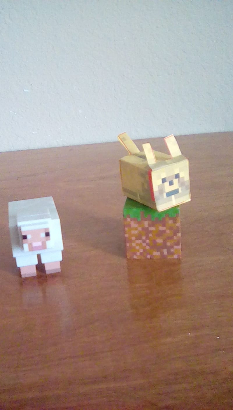 Here's a photo of my yellow wolf named Happy hanging out on a grass block not caring about the sheep (even though wolves love sheep).