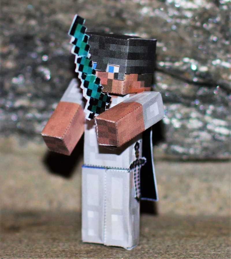 Katana is a little ruined, got stepped on -_- Not in the photo but his cape is a Minecon 2012 cape. If you want to see what this looks like type in "cape" and scroll down...it is dark blue with a gold sword hilt on the back :D