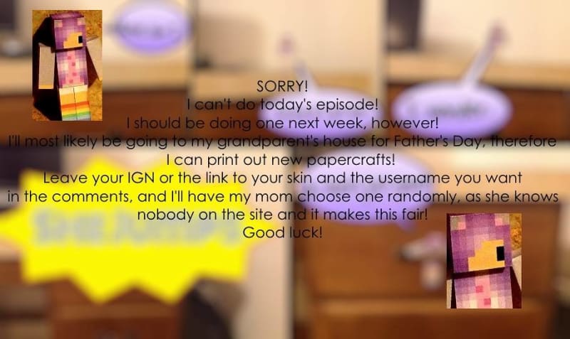 Sorry! I can't do today's episode! I should be going to my grandparent's for Father's Day, and there I can print new colored papercrafts. Leave your IGN if you have a MC account or leave a link to the skin you want and the username you'd use if you had a MC account! I'll have my mom randomly choose a comment so it's fair, good luck to you all!
