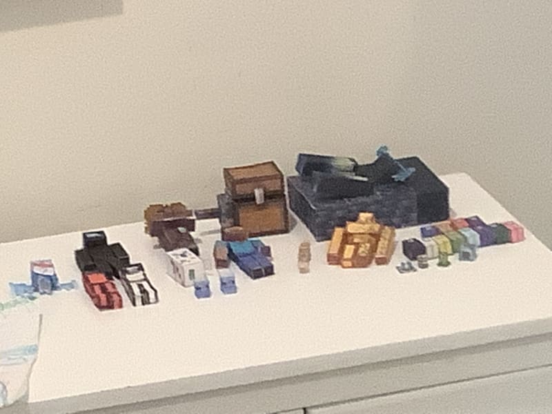 Papercrafts that we’re to big I couldn’t fit or I have no idea where they are: Unbreakable one life size parrot giant bendable zombie all of my Minecraft dungeons artifacts my full size witch hut all of my designs that you do not see in the photo my mob heads my fishes my armor stand my chicken fall guys